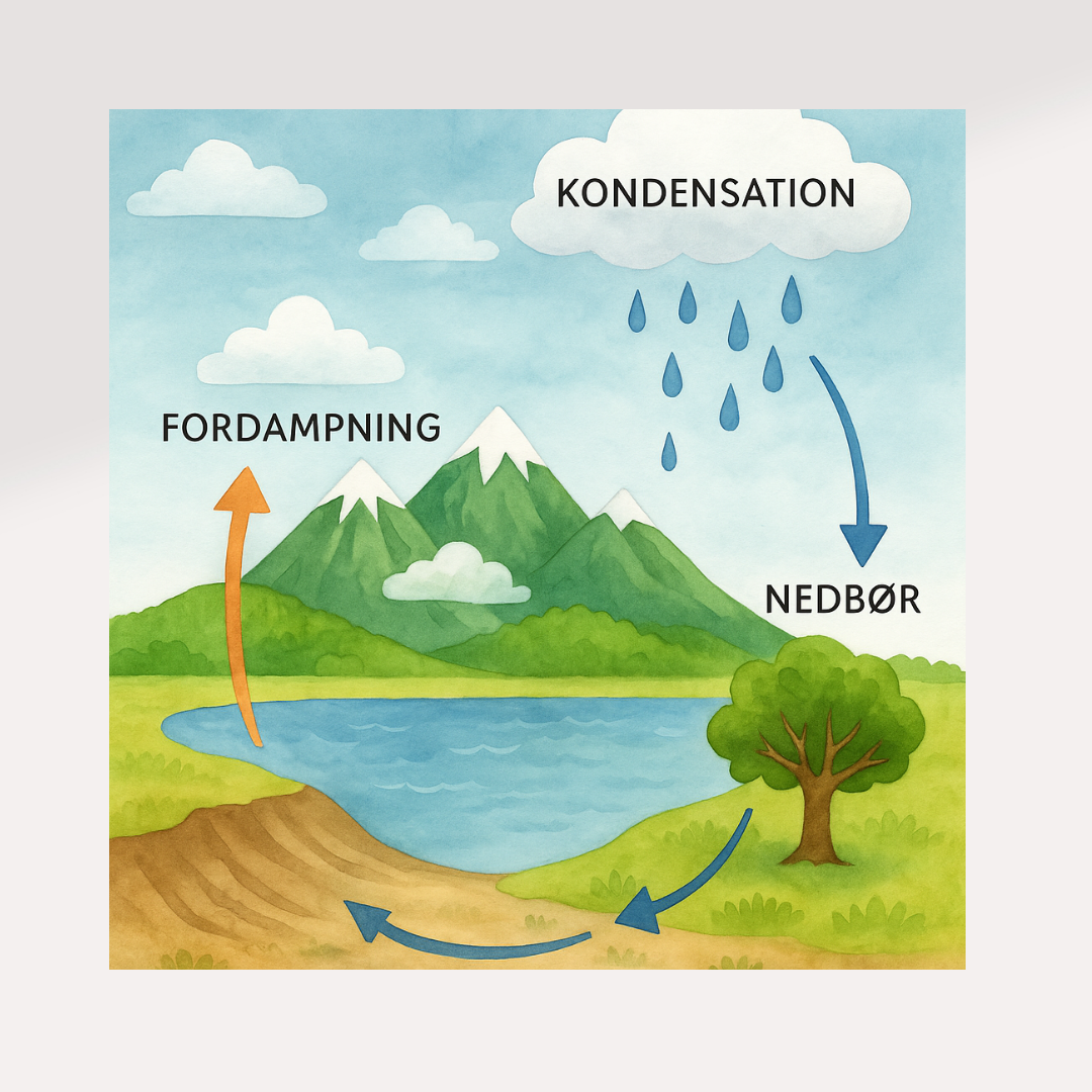 Et farverigt og enkelt læringskort, der viser vandets kredsløb med fordampning, kondensering og nedbør. Perfekt til børn, der skal lære om naturen, eller som visuel støtte i hjemmeundervisning, skole og daginstitution.